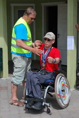 Peakohtunik näitab Aini peal ette, kuidas on õige kuuli tõugata
