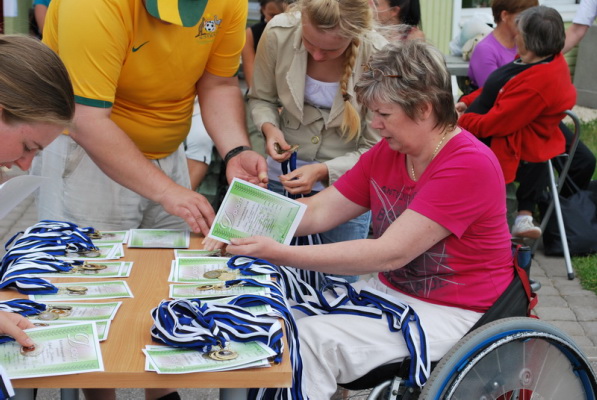 Eesti Invaspordi Liidu peasekretär Signe Falkenberg seab diplomeid ja medaleid rivvi